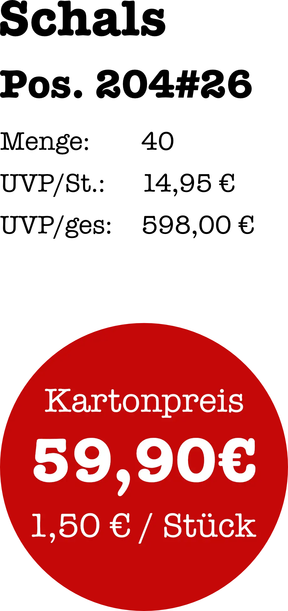 Pos. 217#39 Stückzahl 20 UVP/Stück 18,95 UVP/gesamt 379,00 Preis/Stück 1,99 Kartonpreis: 39,90 €Material: ViskoseWichtige Information: Beim angebotenen Artikel handelt es sich um einen gemischten Posten. Die Anzahl der einzelnen Designs und Farben sind in...