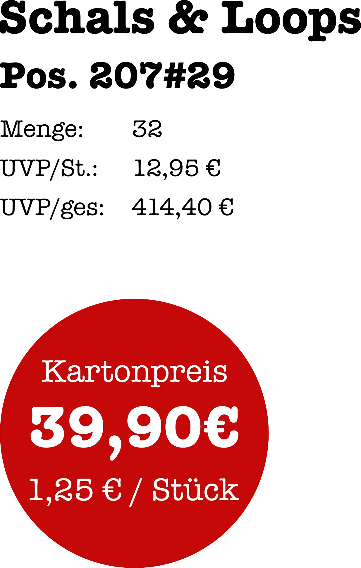 Pos. 217#39 Stückzahl 20 UVP/Stück 18,95 UVP/gesamt 379,00 Preis/Stück 1,99 Kartonpreis: 39,90 €Material: ViskoseWichtige Information: Beim angebotenen Artikel handelt es sich um einen gemischten Posten. Die Anzahl der einzelnen Designs und Farben sind in...